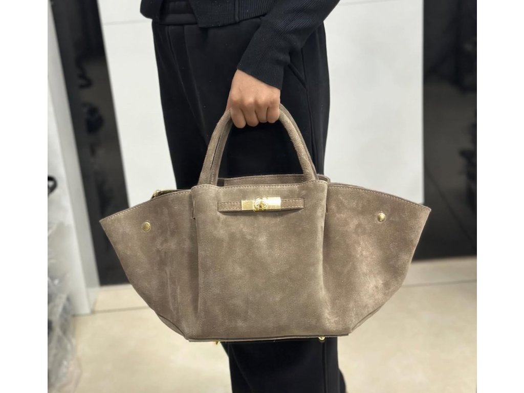 Luxusní semišová kabelka ve tvaru, který jste za poslední dobu mohli vidět v mnoha módních článcích. Uvnitř najdete kapsičku na zip. Součástí kabelky je popruh přes rameno.