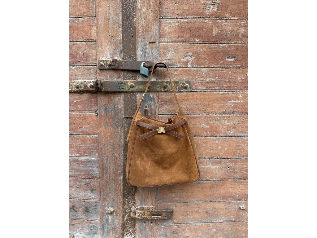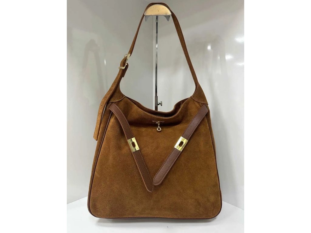 Elegantní semišová kabelka s prostorným vnitřkem a praktickým ramenním popruhem. Zaujme originálním zapínáním z hladké kůže doplněným zlatým detailem. Ideální pro každodenní nošení i speciální příležitosti, kdy chcete kombinovat praktičnost s nadčasovým designem. Uvnitř praktické kapsičky.