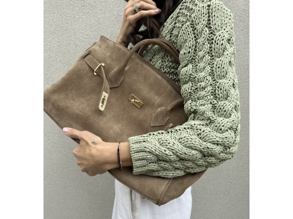 Velká a prostorná kabelka z jemného semiše v neutrální taupe barvě, ideální pro každodenní použití. Díky svým rozměrům pohodlně pojme dokumenty formátu A4 a další denní potřeby. Nadčasový design a kvalitní materiál zajišťují, že kabelka zůstane stylovým doplňkem po dlouhou dobu. Uvnitř má kabelka kapsičku na zip, rozdělovač a kapsičku na telefon. Ke kabelce je i širší popruh přes rameno (3,6 cm).