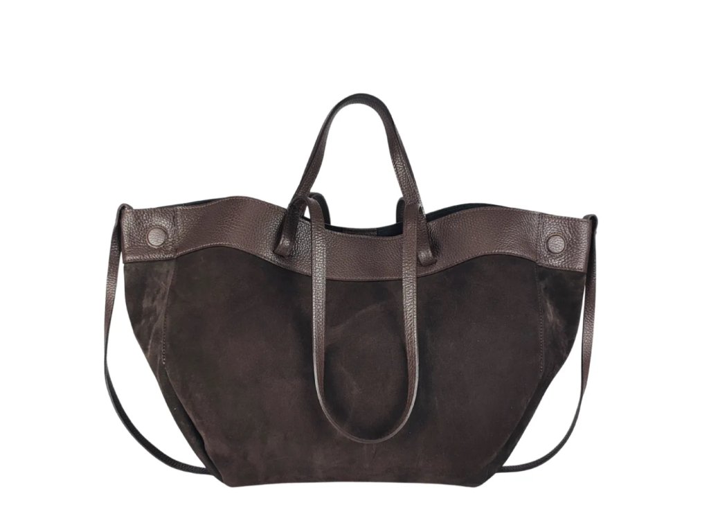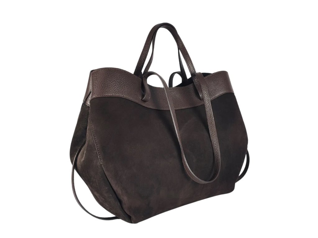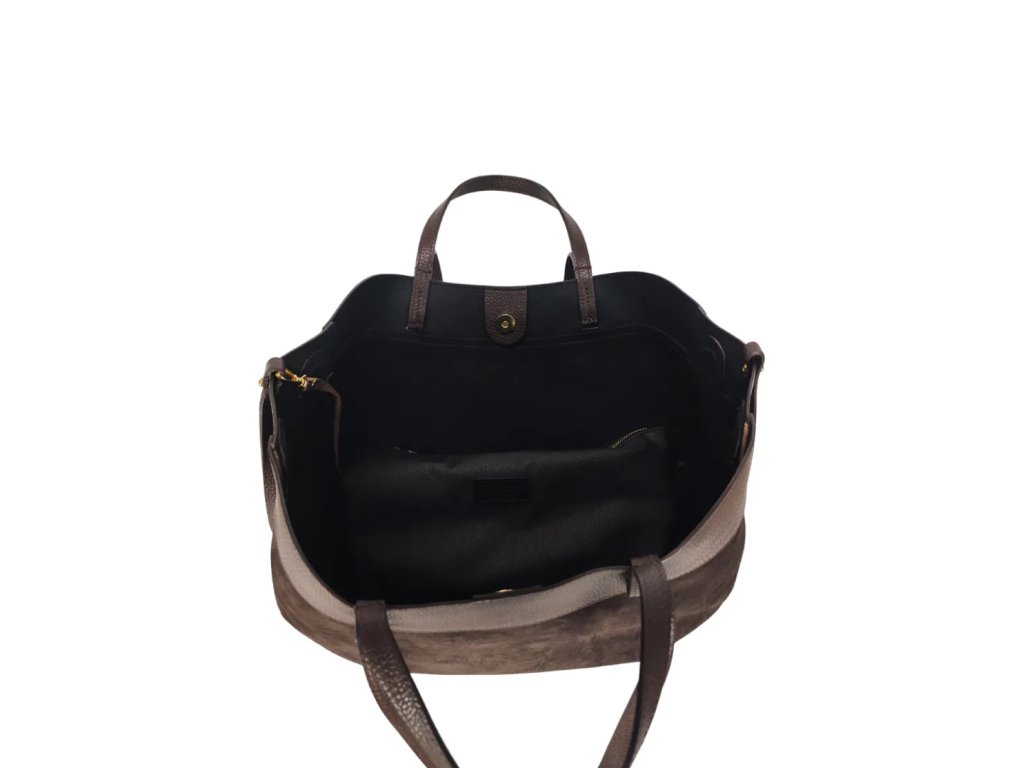 Prostorná stylová semišová kabelka se zajímavým prvkem z kůže tě nadchne svým nadčasovým vzhledem. Součástí kabelky je i minitaška na zip.